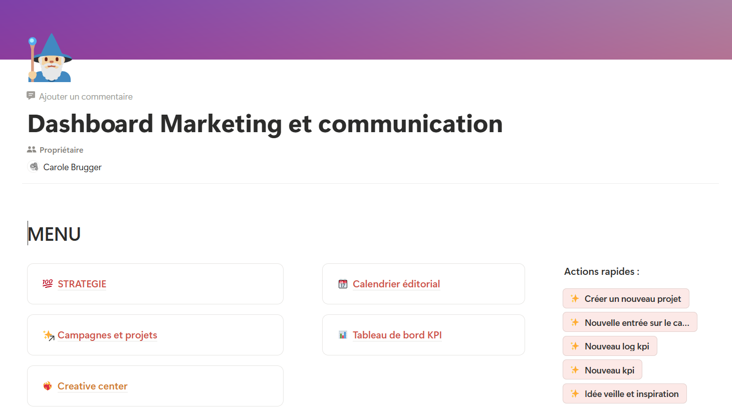 Un cockpit avec une vision 360 sous Notion, qui permet un pilotage global et transverse de la communication et du marketing, de la stratégie jusqu’à la production de contenu et l’animation des projets.